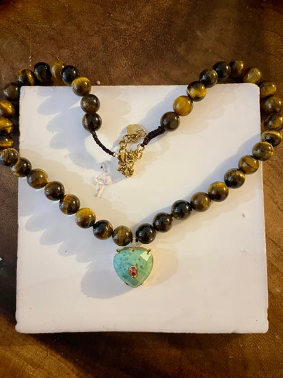 Collier VERA en perle et pierre UNAKITE en forme d'oeil protecteur.